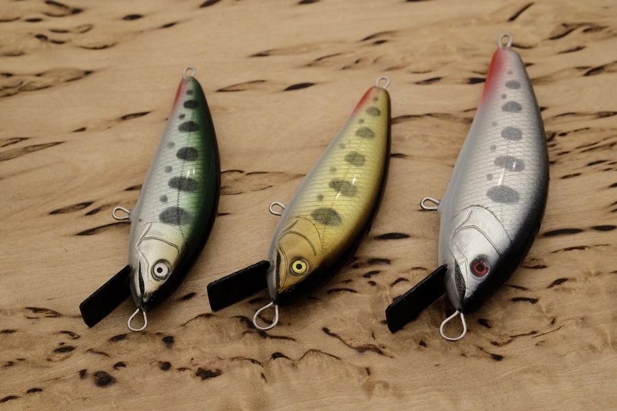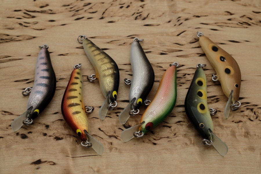 左から ヤマメ、赤金ヤマメ、GGOパー、アユ、ライムアルビノ、かえる