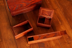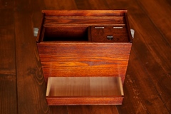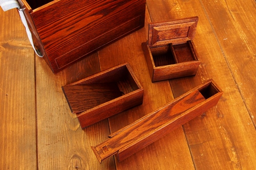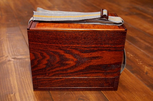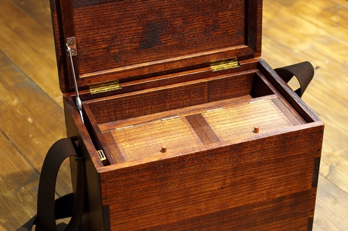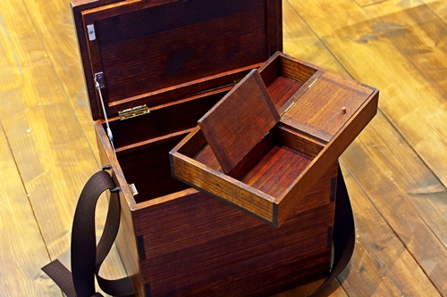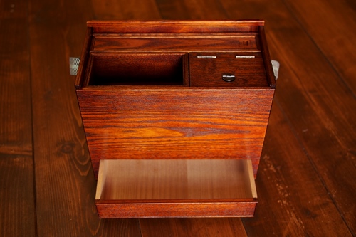 玄圃梨を国産漆で拭き仕上げ。中籠は竿入れ、エサ入れ、落とし込みの3パーツ。落とし込みを中蓋で塞いで道具箱として使用可能です。