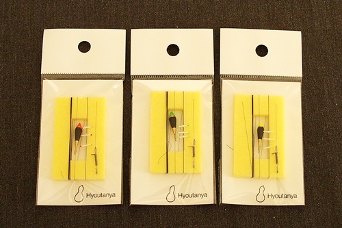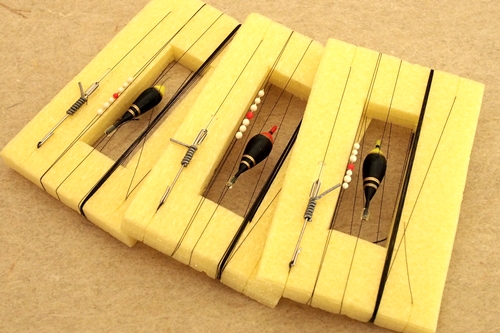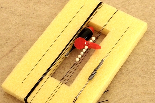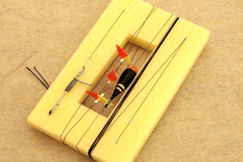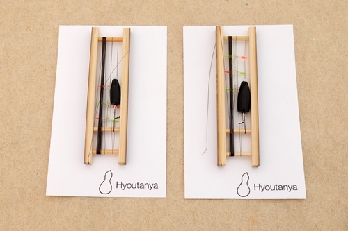山吹素材の斜め通し浮子にシモリをセット。道糸はティムコのモノスレッドを使用