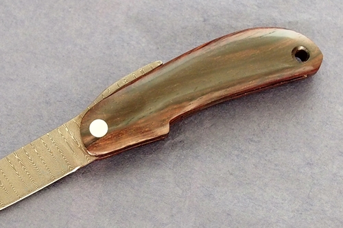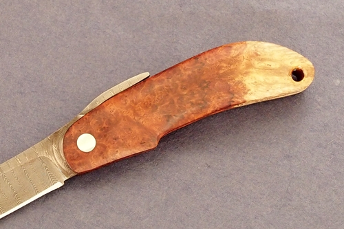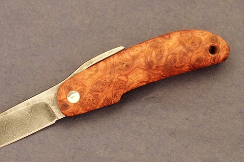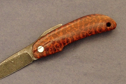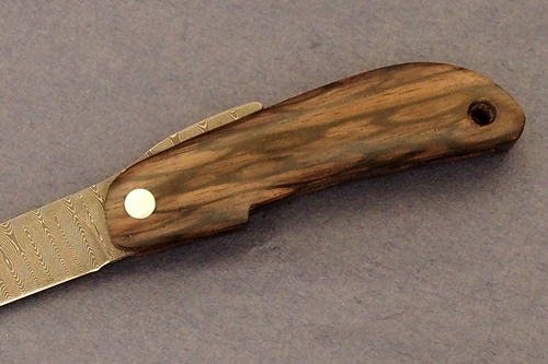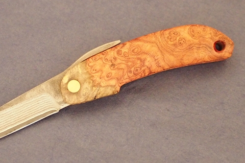 樹脂含浸処理を施した無垢の銘杢ハンドル、VG10鋼とダマスカス地金ブレード。刃長 55mm